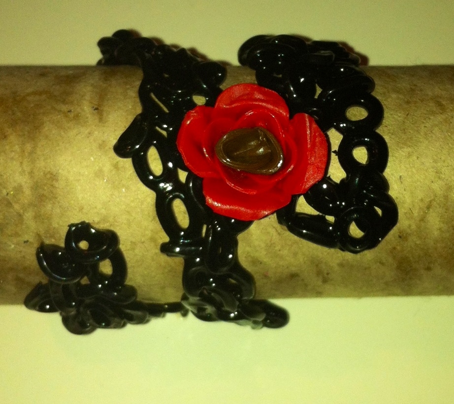 Råt spiral armbånd i sort med en rose, der dækker over låsen. Du kan se de andre ting jeg har lavet under Photogallery
